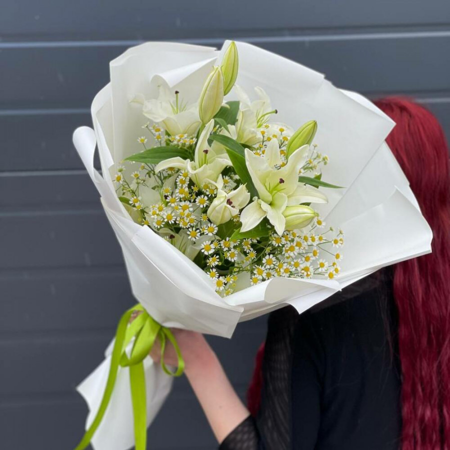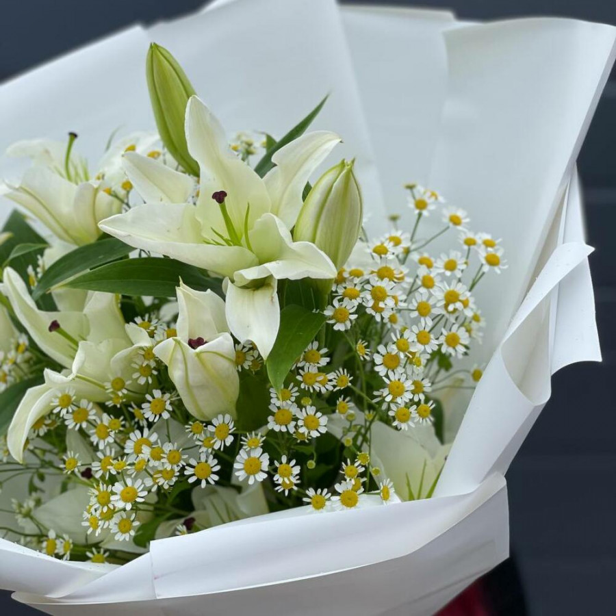 На фото букет «молочный шепот». В составе: лилия 3 шт, танацетум 5 шт, дизайнерская упаковка 1 шт, атласная лента 1 шт, . Все цветы свежие и ароматные, букет красиво оформлен и отлично подходит для подарка. Доступна доставка цветов или самовывоз.