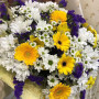 Солнечные зайчикигербер в окружении белых ромашковидных хризантем и сиреневой статицы напомнют получательнице о теплом лете, светлом безоблачном небе и бескрайних просторах, полях ромашек и васильков. Подарите своей любимой кусочек лета в пасмурный день.