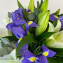 На фото букет из белых лилий с синими ирисами. В составе: лилия 5 шт, ирис 9 шт, эвкалипт 1 шт, дизайнерская упаковка 1 шт, атласная лента 1 шт, . Все цветы свежие и ароматные, букет красиво оформлен и отлично подходит для подарка. Доступна доставка цветов или самовывоз.